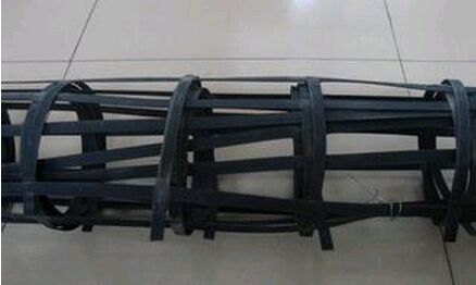 鋼塑土工格柵以高強鋼絲(或其他纖維),經特殊處理,與聚乙烯(PE)或聚丙烯(PP),并添加其他助劑,通過擠出使之成為復合型高強抗拉條帶,且表面有粗糙壓紋,則為高強加筋土工帶。由此單帶,經縱、橫按一定間距編制或夾合排列,采用特殊強化粘接的熔焊技術(超聲波焊接技術)焊接其交接點而成型,則為鋼塑土工格柵。